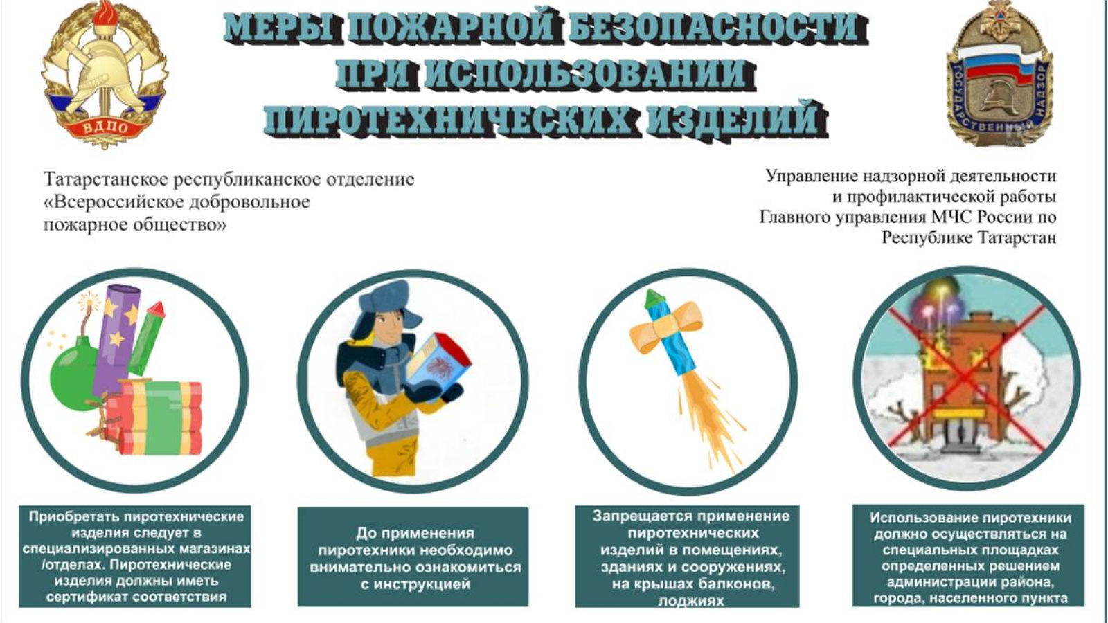 Главное управление МЧС России по Республике Татарстан сообщает, что в период проведения новогодних праздничных мероприятий возрастает вероятность возникновения пожаров из-за нарушений требований пожарной безопасности при эксплуатации электрооборудования и неосторожного обращения с пиротехническими средставми. Будьте осторожны, берегите себя и своих близких!