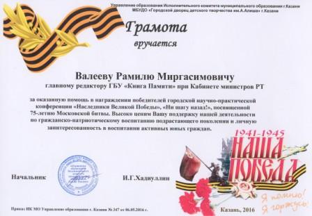 Вәлиев Рамил Миргасыйм улына Казан шәһәренең А. Алиш исемендәге балалар иҗаты сарае грамотасы